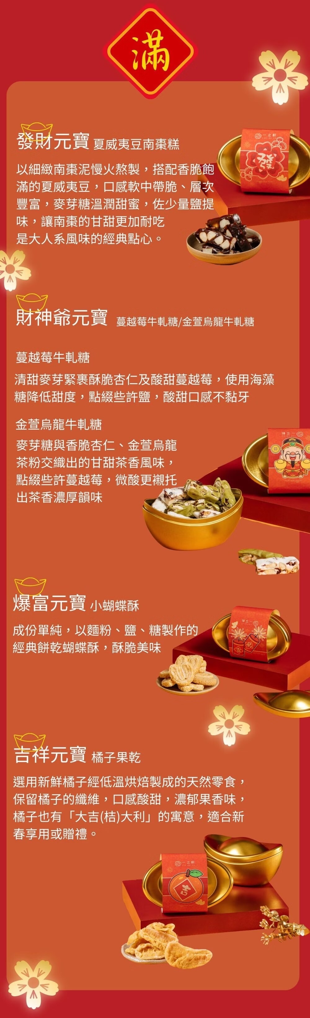 ✧ 四入金元寶含夏威夷豆南棗糕 / 綜合牛軋糖 / 小蝴蝶酥 / 橘子果乾
