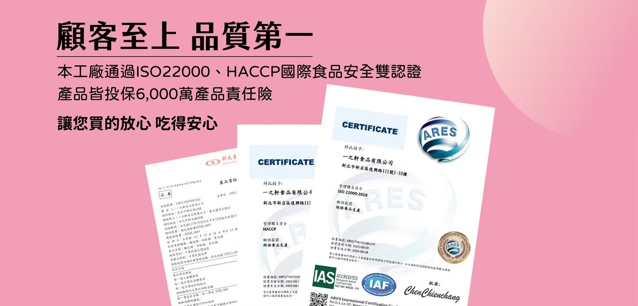 本公司已投保新光產物保險產品責任保險,保險期間內最高賠償責任新台幣6,000萬元,食品工廠登錄字號:F-122751743-00001-5。如因本服務條款產生任何爭議,除法律另有規定者外,雙方同意以台灣台北地方法院為第一審管轄法院,並以中華民國相關法律為準據法